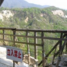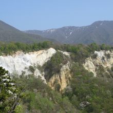 十二湖に行く途中に“日本キャニオン展望台”と言うところがあります。展望台と言っても、崖のふちを木の柵で囲っただけで、立ち入り禁止の看板があって今にも壊れそうな怖いところでした。そこから、緑の山の中に白くがけ崩れの様なキャニオンが見えました。名前は、アメリカのグランドキャニオンに似ていることから名づけられたそうですが、規模も小さいし、かなり言いすぎ・・・。