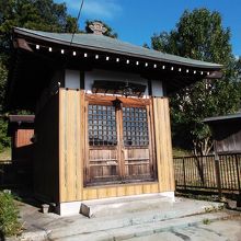 そこの奥、住宅の庭先のような空地にお堂が・側に古い石塔仏類が・。