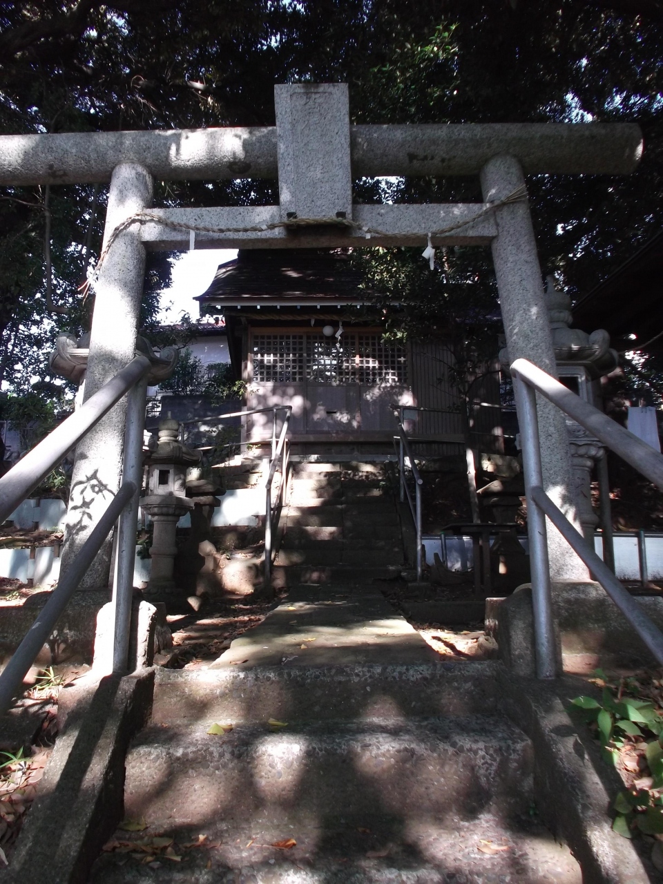 ここ、座間市入谷5丁目の小高い森、傾斜地に張付いているような神社です。道路から急な石段登りつくと古木の中に社殿があります。御賽銭箱は見当たりません。お参りする鈴などは外にはありません(社殿の中)。ちょっと異様さありますが、これも神社。お参りさせていただきました。