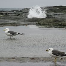 約12キロに渡って平坦な岩場が広がる海岸で、寛政の大地震によって、荒波に浸食された海底の岩盤が隆起して、現在のような景観になったと言われています。海岸には、千畳敷海岸、潮吹き岩、カブト岩、ライオン岩などの奇岩があり、遠くに竜飛岬、その先の北海道が見えます。