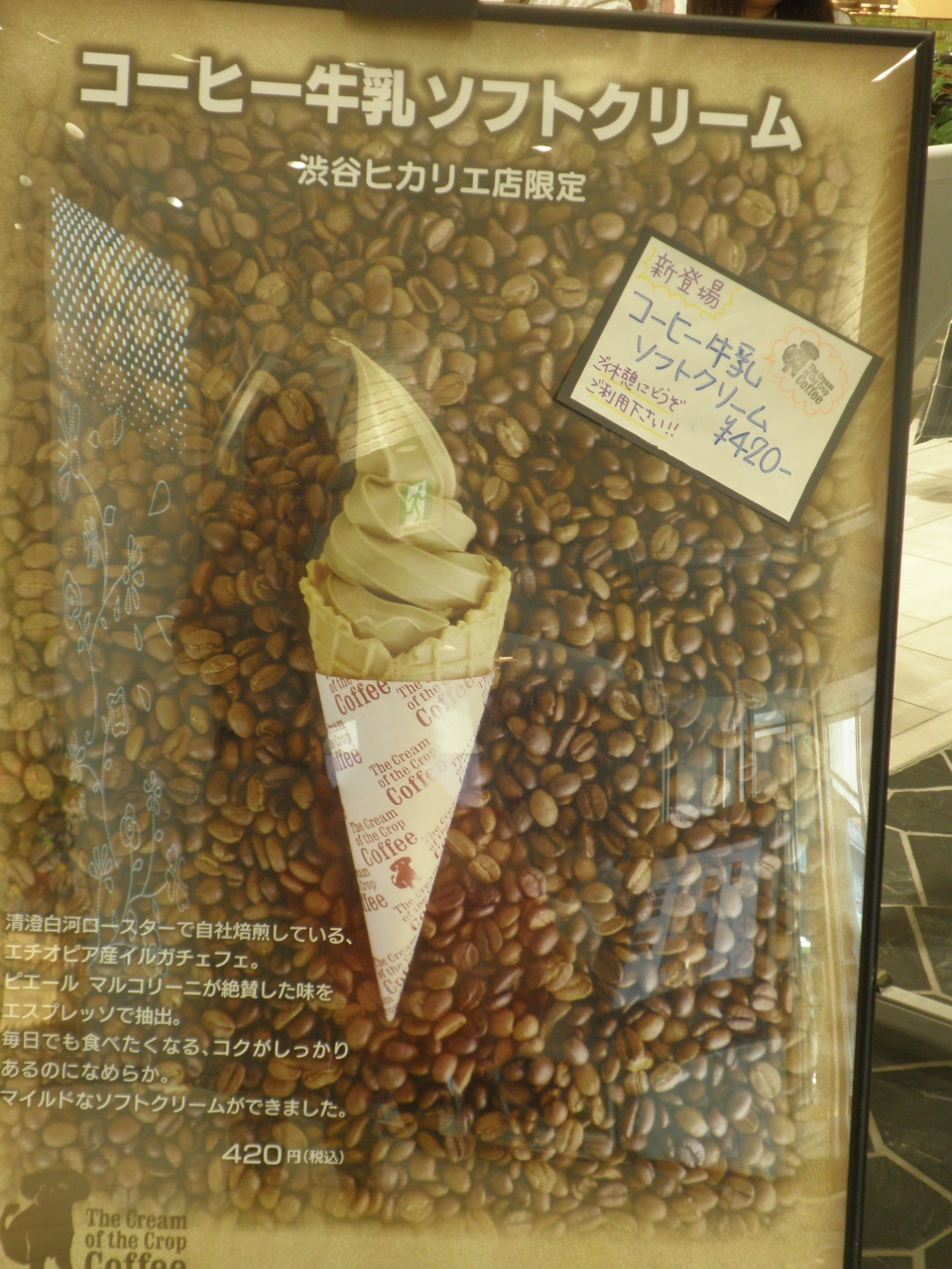 ショッピングの休憩にコーヒーを飲もうと立ち寄ると、入口に「ヒカリエ限定!コーヒー牛乳ソフトクリーム¥420」の看板が目に入りさっそく注文しました