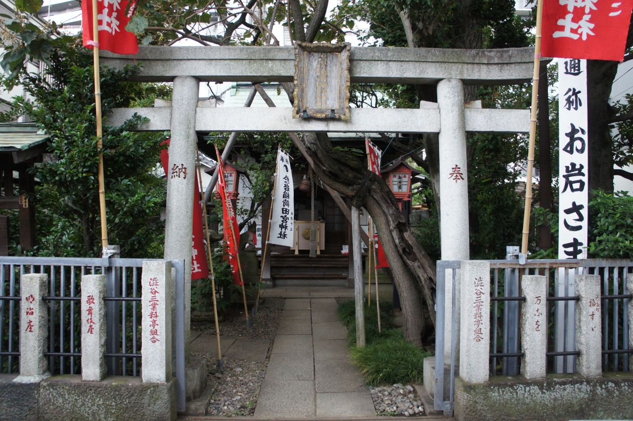 於岩稲荷田宮神社は、四谷怪談で有名なお岩さんの神社。閑静な住宅地の中にありました。ところが、案内板を見ると、「於岩」というのは「お岩」という江戸時代の初めごろ、四谷左門町で健気な一生を送った女性のこと。夫婦仲もよかったのだそうで、福を招き、商売繁盛のご利益があるとされていて、怪談話とは全く結びつかない内容でした。