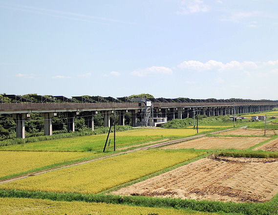現在その高架の一部区間には、ソーラーパネルが並べられており、列車からその光景を眺めることが出来ます。