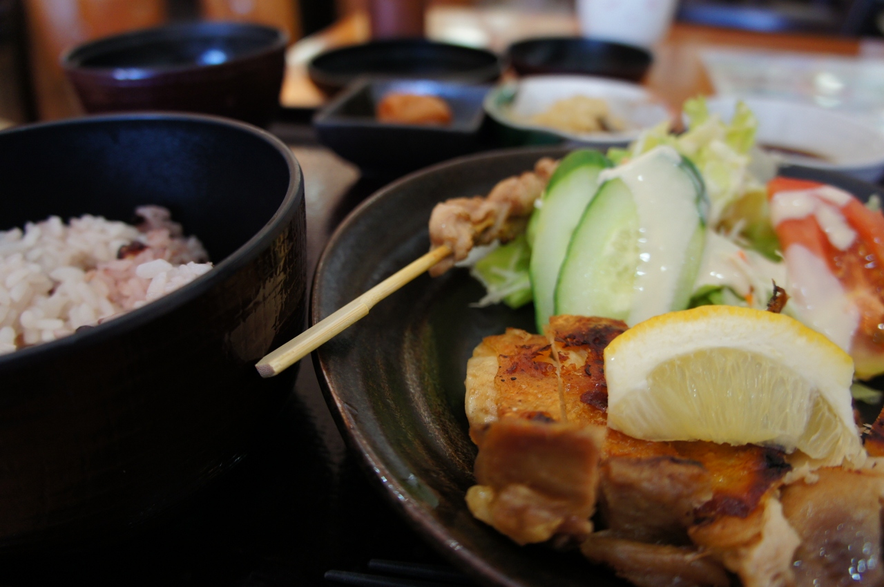 スローフードレストラン「茶すり庵」で昼食を食べました。おすすめにあった「かに美鶏のカリカリ焼き定食」を食べました。かに美鶏とは,地元の名産であるかにを飼料にして育てた鶏のことだそうです。ご飯は「古代米」と「白米」から,古代米を選びました。定食はなかなか上品な味でおいしかったです。