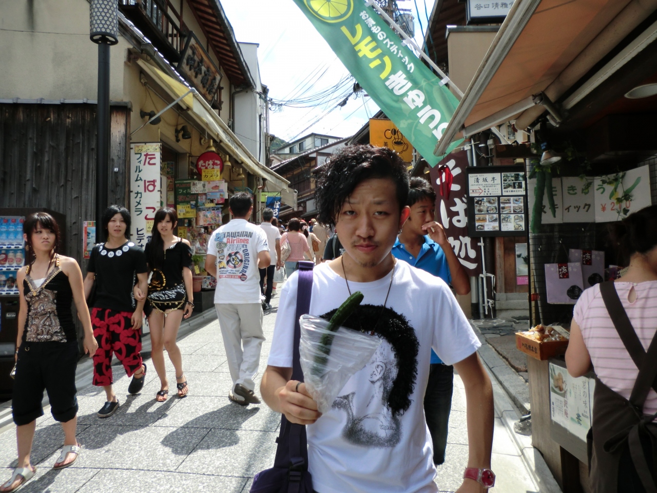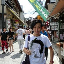 観光で清水寺に寄り、帰りの道には沢山のお土産屋や立ち食い屋台などがあります。