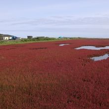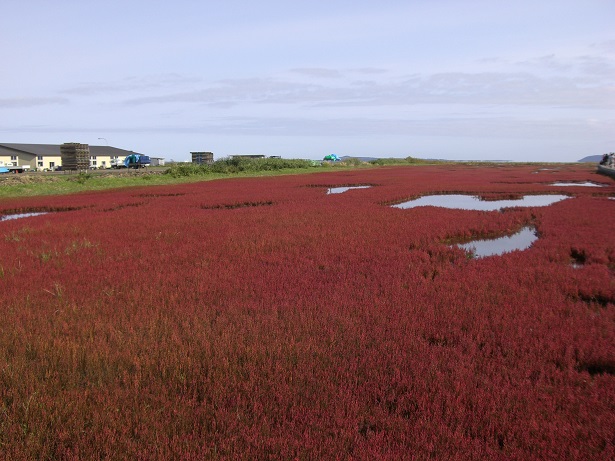 正式には「アッケシソウ」と呼ばれるサンゴ草が湖一面を覆い尽くしておりとにかく赤いです。物珍しさからか、観光客が大勢いました。学術的には、学名はSalicornia europaeaと言い、アカザ科に属する一年草で背丈は15~25センチ、特に強い耐塩性を持っています。能取湖では毎年9月の「さんご草まつり」が開かれ、ホタテやツブの即売・賞味会、歌謡ショーなどが行われますが、特に狙ったわけではないですが、行った時にちょうど開催されていました。見頃は9月末くらいまでです。