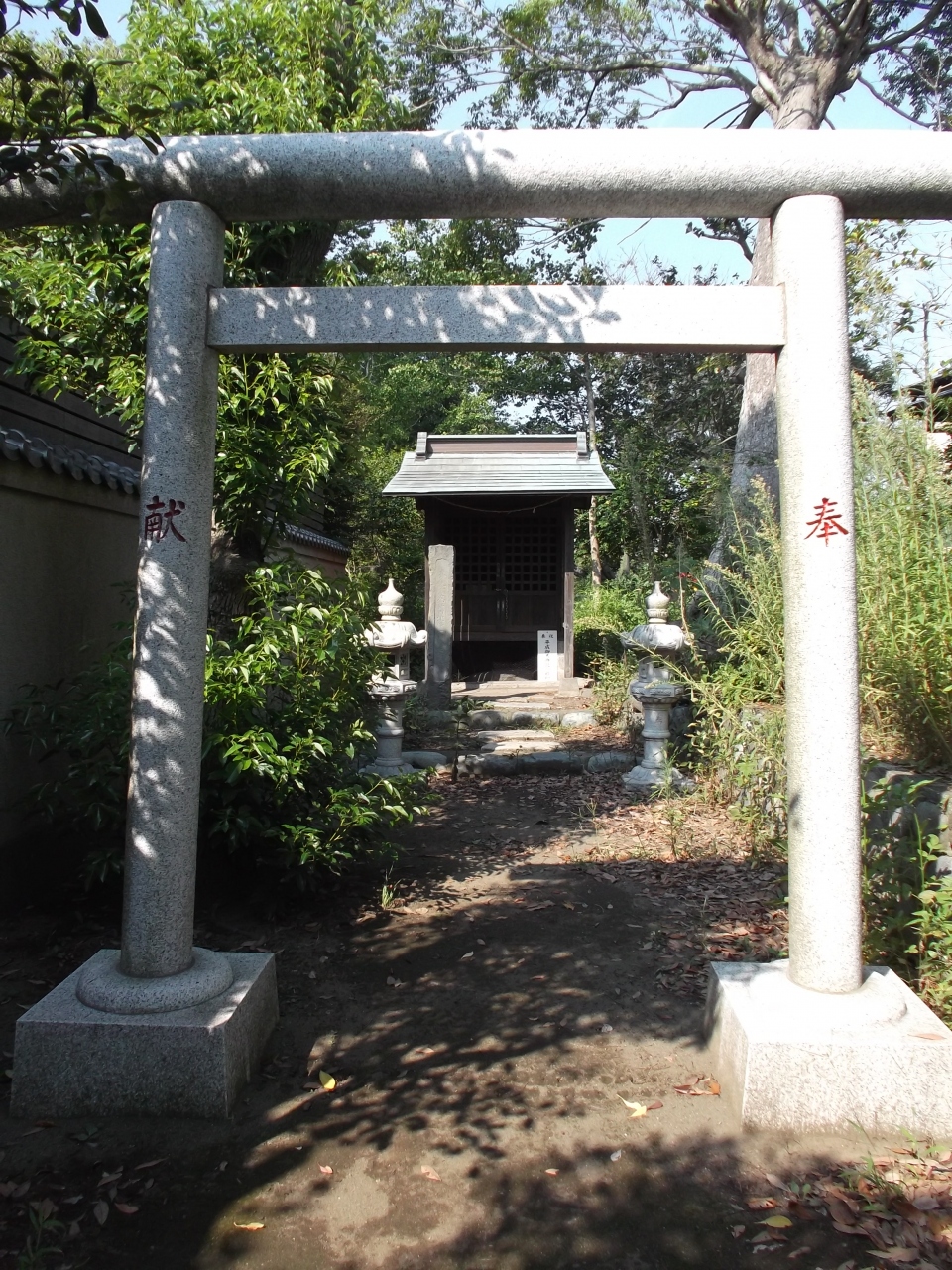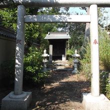 地図に表示されていますが見つけにくいところです。過っての辻堂村、古道歩きでようやく見つけ。個人宅の塀脇に沿って1米幅の小径が参道(入口の石柱見落とすとわからない)です。参道奥に鳥居、お社(祠)がひっそりと・周りは草で覆われているか・・。
