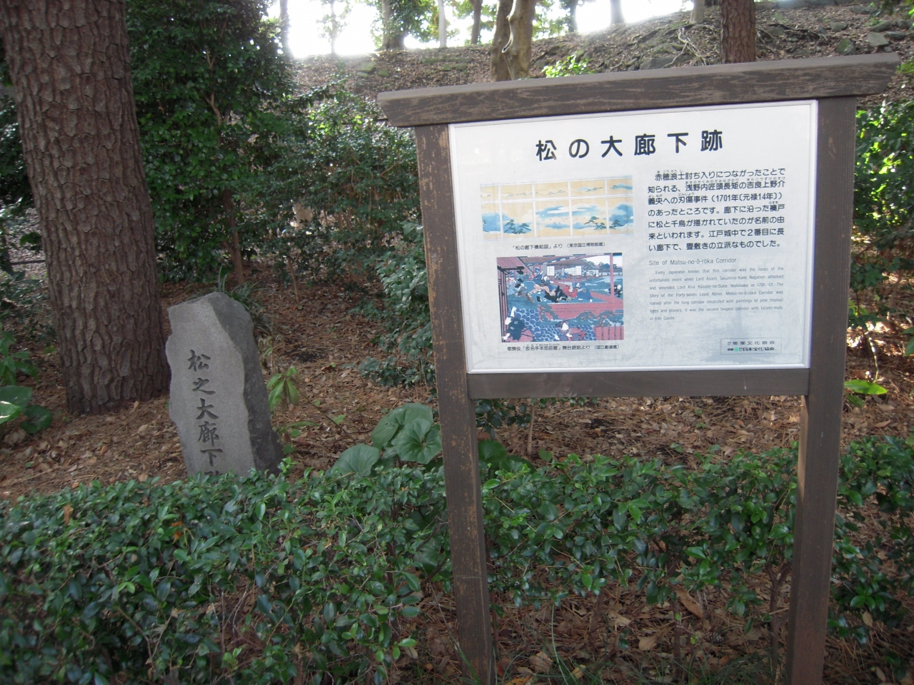 赤穂藩主浅野内匠頭が吉良上野介[に切りつけたのが江戸城松の廊下で忠臣蔵の発端となった場所である。皇居東御苑の大手門から入り、坂道を登っていくと本丸などがあった広い台地のスペースに出てきます。松の大廊下跡といっても建物は跡形もなく単なる雑木林に小さな碑が立っているだけです。