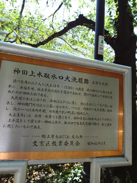 徳川家康が江戸に幕府を作るとき井の頭池からの流れを源流に善福寺池、妙正寺池の流れを落合であわせて、関口で取水して水路を定めたのが神田上水で、上水道としては最も歴史のあるものだそうです。大洗堰で二つに分けられ、内堀の大名屋敷や日本橋方面に給水されたそうです。現在はもう使われていませんが、由来碑が建てられ保存されています。