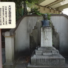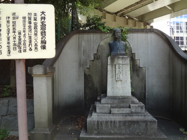 江戸川橋駅を出てすぐ、江戸川公園の入口付近に建てられている胸像です。大井玄洞氏は明治から大正時代にかけて神田川の護岸改修工事に大変尽力された方だそうです。もともとは、幕末から昭和にかけて活躍した薬学者・陸軍薬剤官だそうで、陸軍退役後小石川に移り住み区議会議員となり、洪水が頻発していた江戸川(現在の神田川)の治水工事に尽力されたそうです。