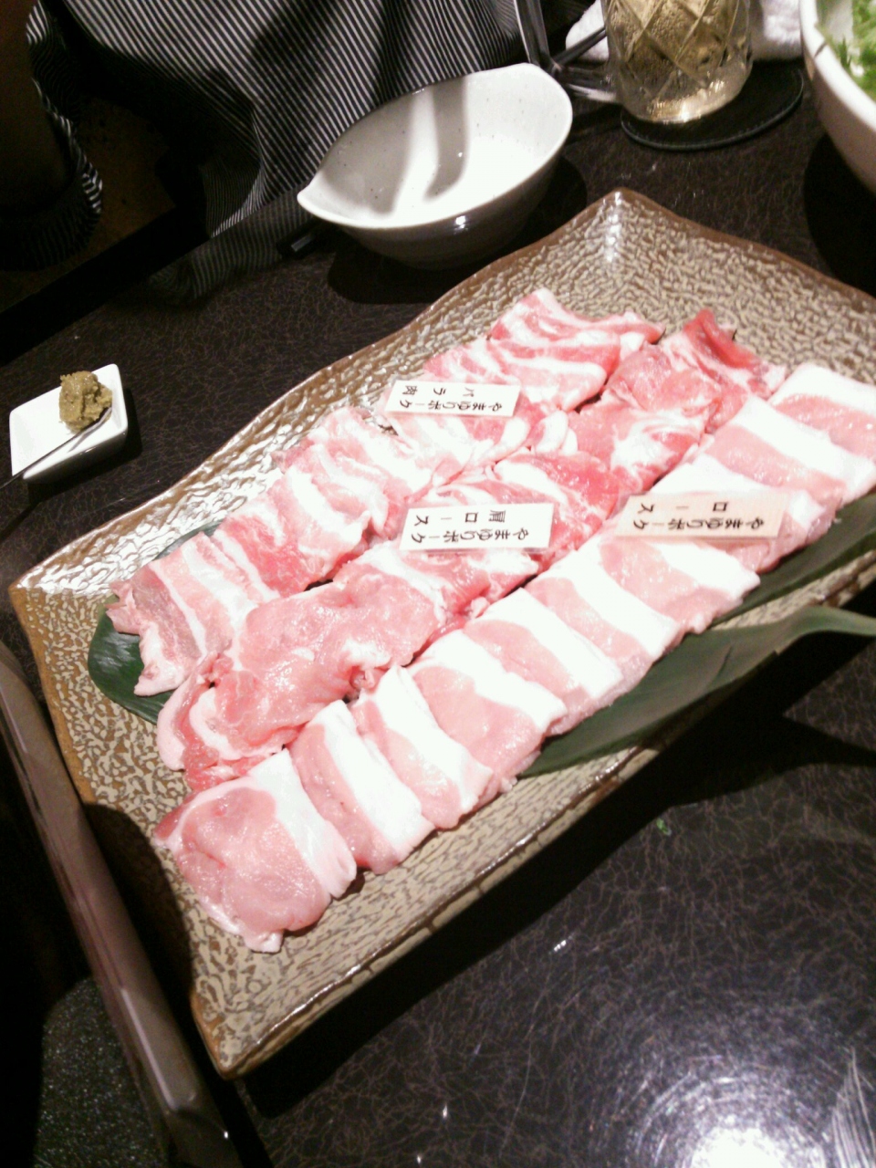 豚しゃぶのコースでしたが、豚しゃぶの前にいろいろな一品料理が出てきて、最後の締めに豚しゃぶが出てきます。出汁でしゃぶしゃぶして、ゆず胡椒の薬味をつけて食べます。意外とあっさりしていて、おいしくいただけました。