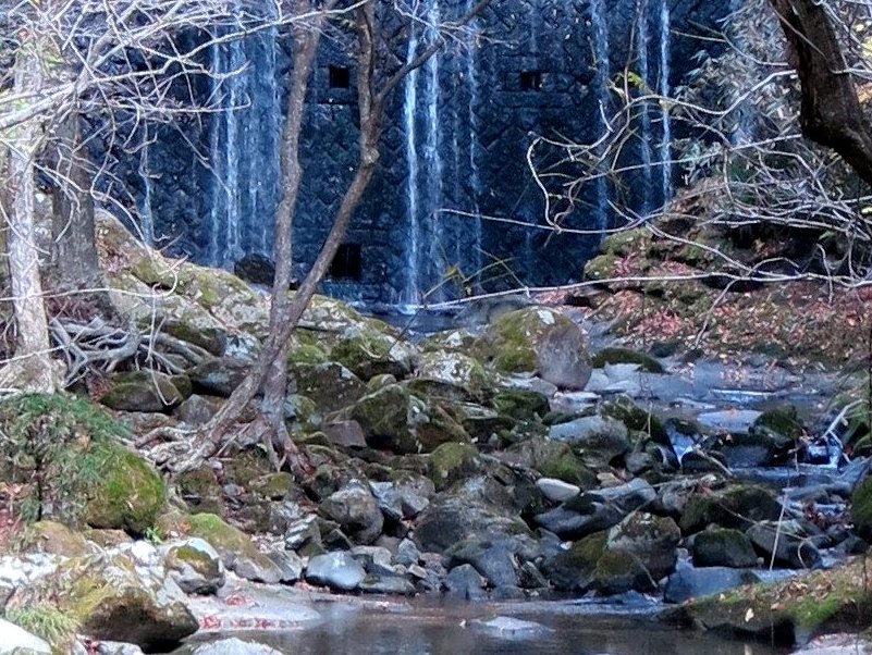 紅葉の木々でトンネルになっている「汐見滝吊り橋」を渡り、