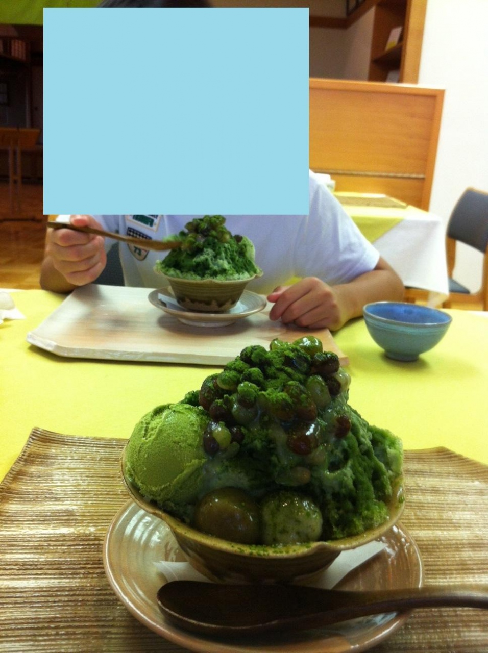 かき氷好きの妻と息子は「お抹茶のかき氷」、私は「抹茶あいすパフェ」。