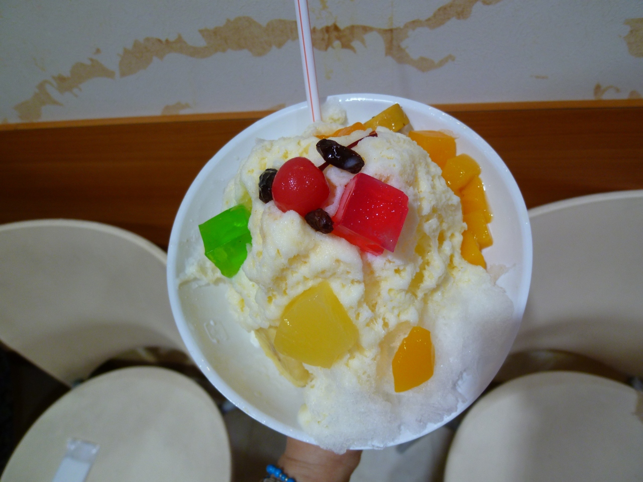甘ったるくない、さっぱりミルクのシロップに、フレッシュなフルーツ・缶詰のフルーツ・クッキー・煮豆が入ったかき氷♪