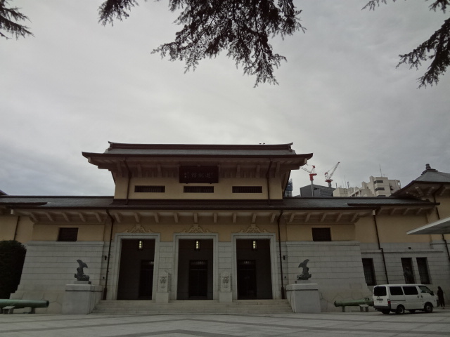靖国神社の本殿手前を右側に曲がると、周囲とは少し趣の違う建物が目に入ります。明治15年に開館した遺品などを収蔵、展示する施設、遊就館で、平成14年に改修、増築工事が施されたそうです。建物の前の広場には、戦争で犠牲になった馬や、犬、鳩などの慰霊碑も建てられていました。