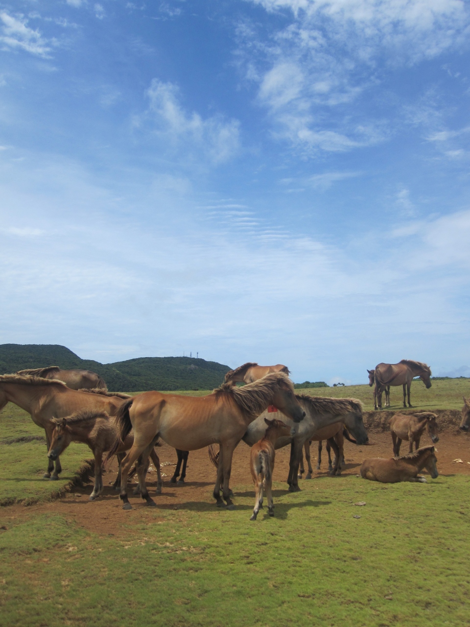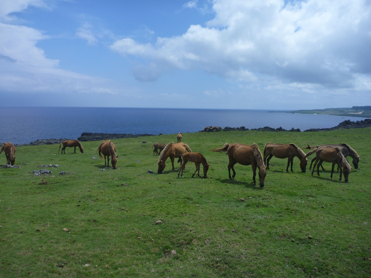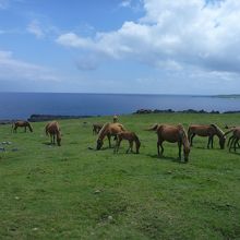 緑色の大地と青い海が広がる景色の中に、与那国馬と牛が闊歩している様は与那国ならではで感動的です。
