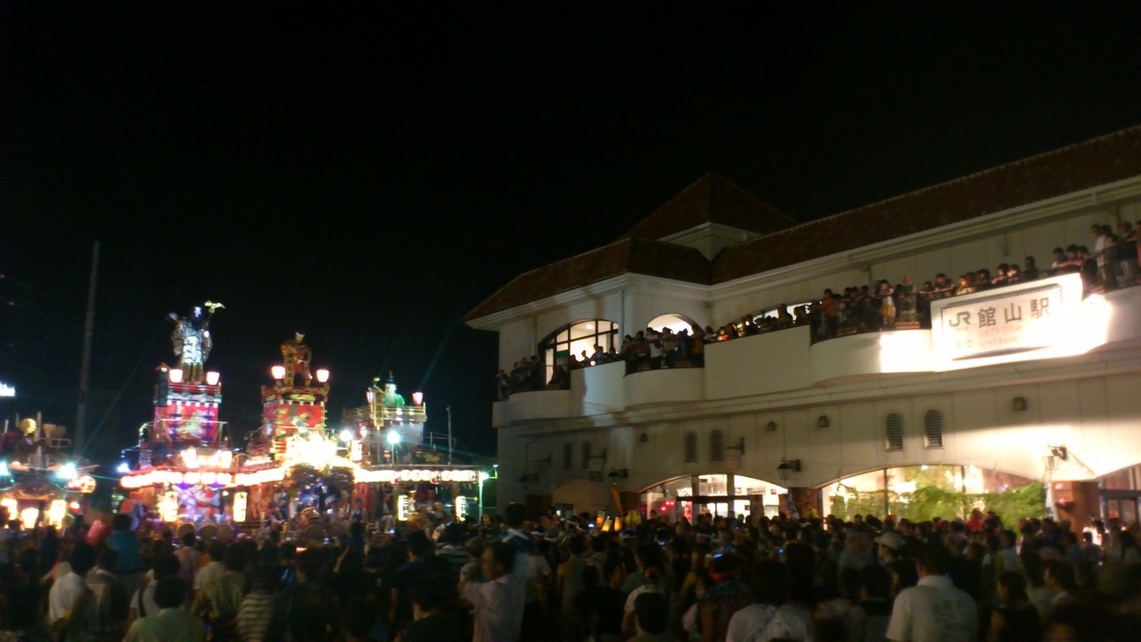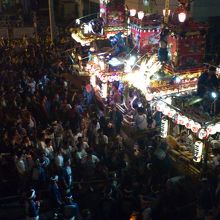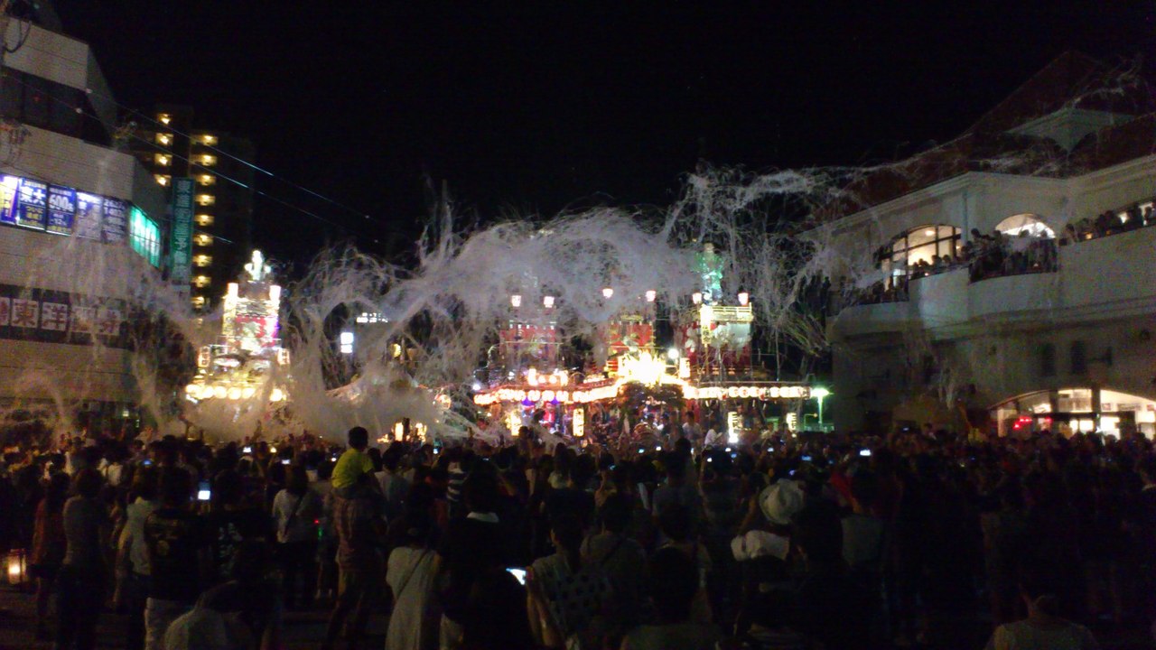 やわたんち祭りのラスト。館山駅前に山車が5台集合します。駅前のロータリーを一周して順序よく並び太鼓の競演。駅の二階から眺めると、勇壮な引き回しの様子がよく解ります。一年で一番賑やかな夜のラストは紙ふぶき。雪が舞っているようです