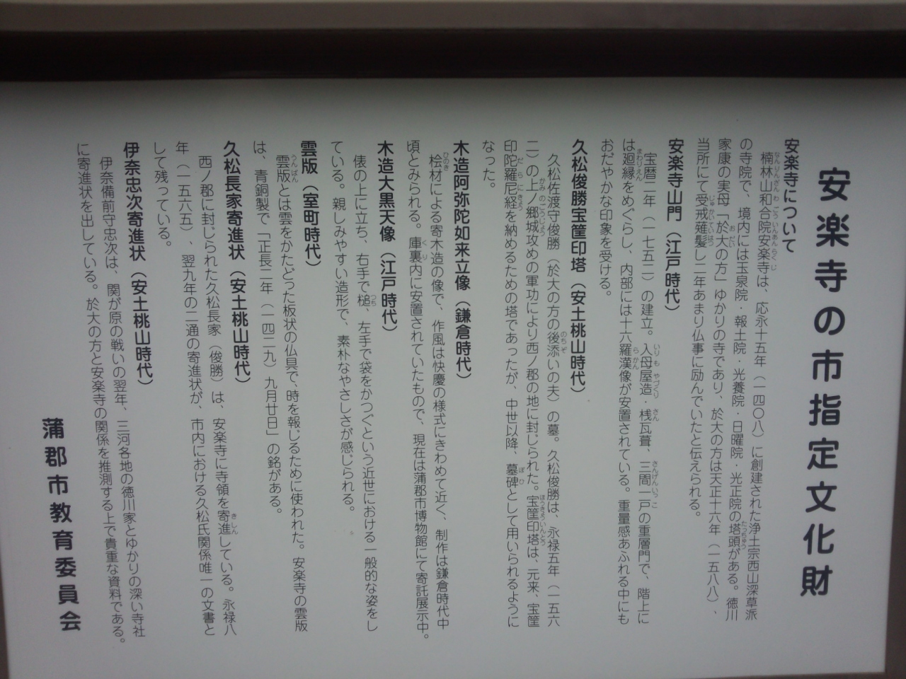 於大の方の再婚相手である久松俊勝が死去後、剃髪して伝通院と称し、2年間滞在した寺院。蒲郡の山麓にあり、海からもほどほどに近いです。国道1号線から向かう場合はくねくねした山道を通らなければいけません。帰路、この道を使い難儀しました。
