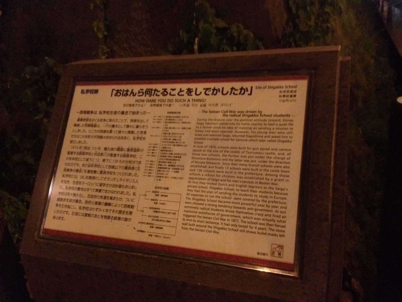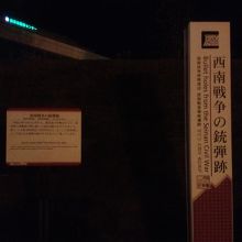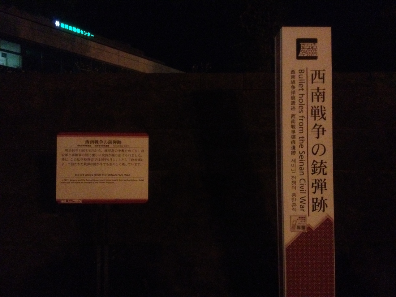 石垣には西南戦争の銃弾の跡が生々しく残されています。なぜここにこんなに銃弾跡があるんだろうか。石垣にこんなにあるということは、本当に狙っていた対象には、これよりもっと銃弾が撃ち込まれたんだろうなぁとか考えると、本当に激戦だったと想像できます。