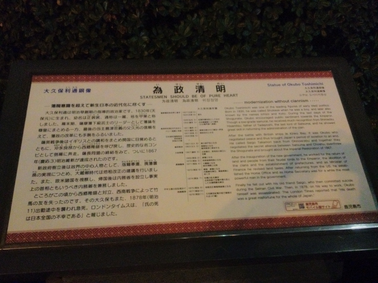 高さが結構ある銅像で偉大さがわかるのですが、なぜか西郷隆盛像のようにライトアップがされていません。せっかく電車通り沿いにあってみんなの目につくのだから、ライトアップすればいいのにね。