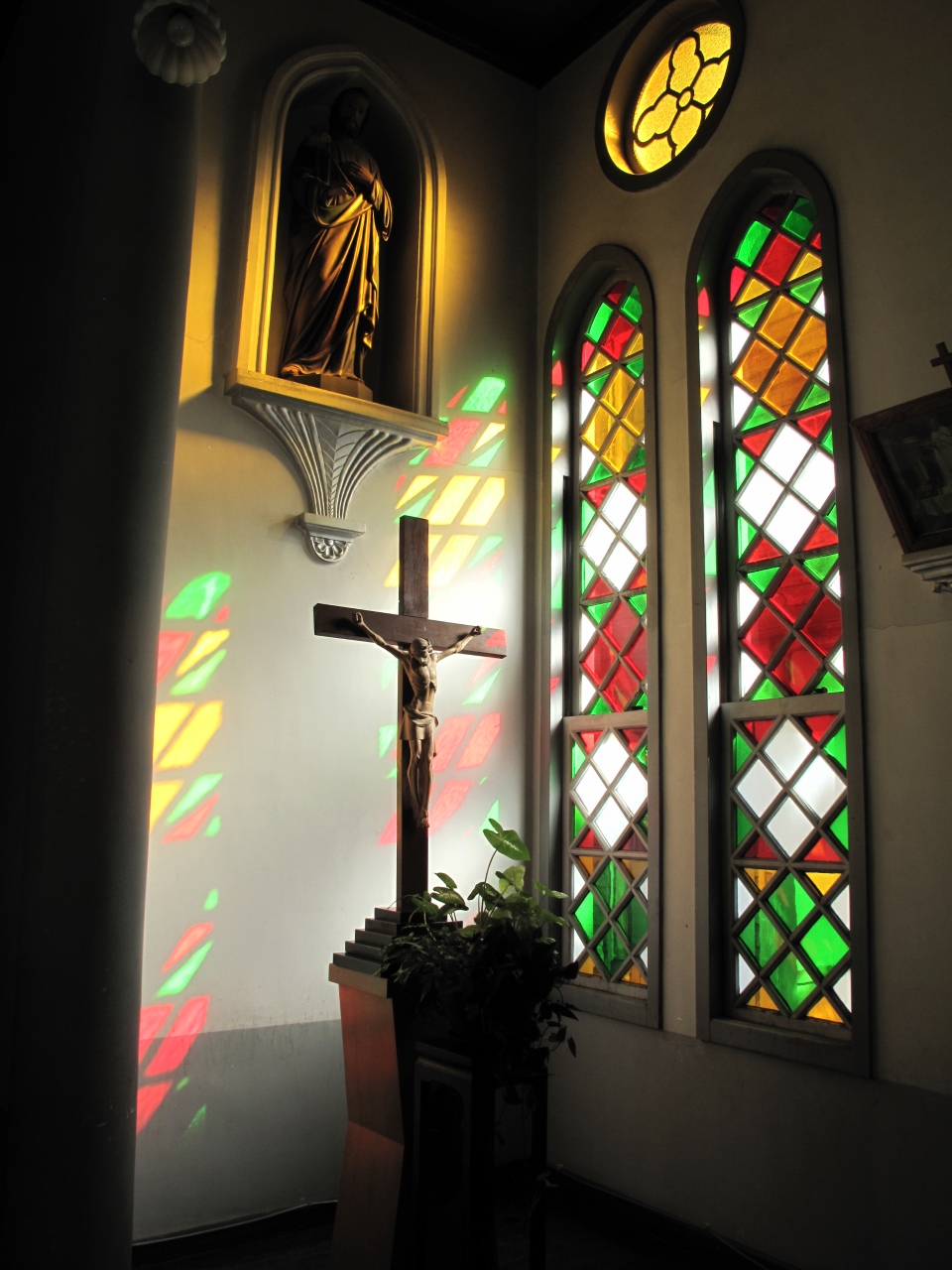 ここには、津和野カトリック教会があります。小さい教会ですが、畳敷きの室内には、ステンドグラスの美しい光が差し込んでいます。