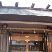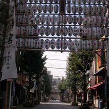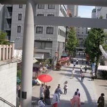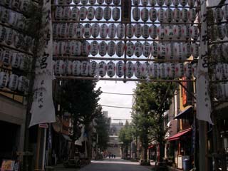 大門から北に向かうと芝大神宮があり、通路を通って正面にまわるとだらだら祭りのお囃子が聞こえてきます。階段の上の社殿に向かうと、ちょうど結婚式の行列があり、参道を横切っていきました。御神輿が出るのは翌日ですが、この日の境内は静かでした。