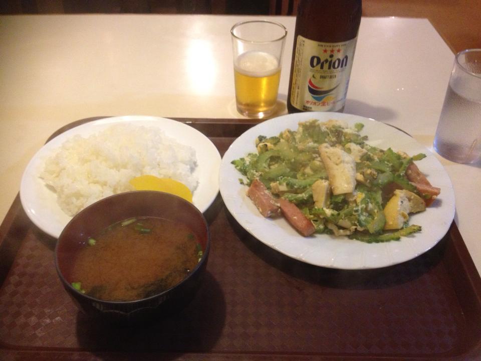 注文したのは「ゴーヤちゃんぷるー定食」550円とオリオンビール。注文して間もなく定食到着。まずボリュームに圧倒されます。食べきれるのかな・・・