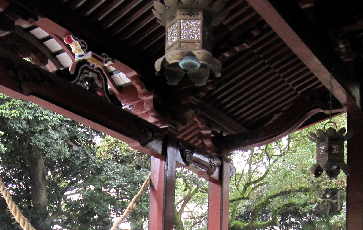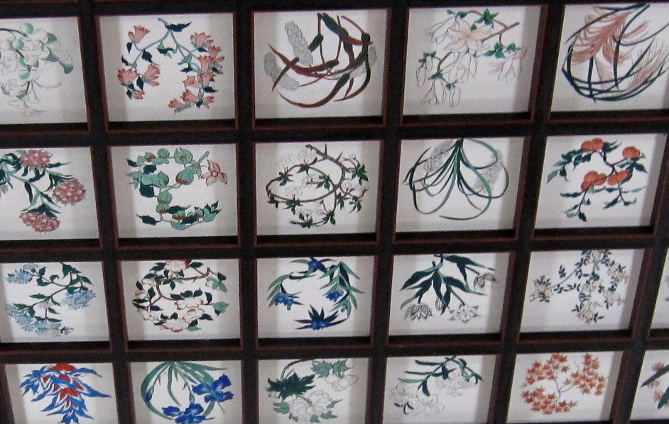 また、社殿の天井格子に色鮮やかな花や野菜等が描かれていたのが