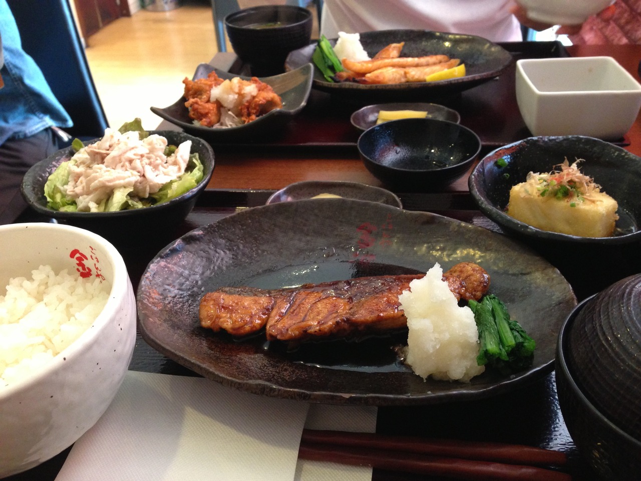 メインには鰤の照焼、小鉢に揚げ出汁豆腐・豚しゃぶサラダを。