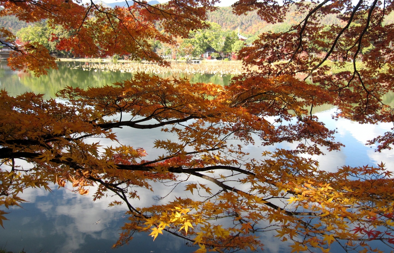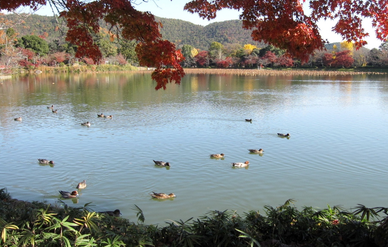 紅葉した木々が池を囲み、鳥たちも群れていて、