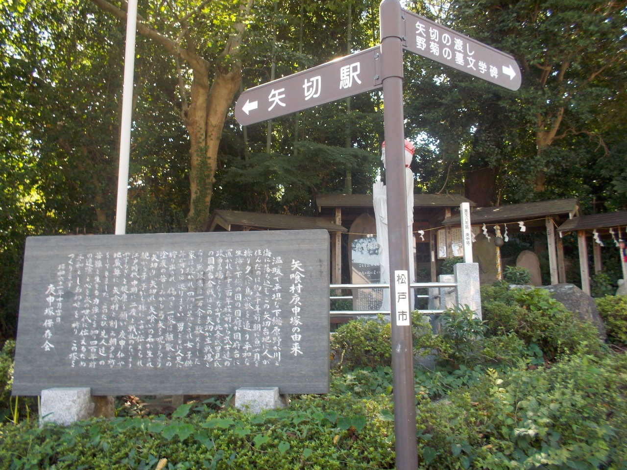 北総線の矢切駅と野菊野墓の間にありますが、目立つ標識がないので、行き方は、あまり簡単ではありません。 駅から松戸方面に信号を1つ分戻り、江戸川方面に歩けば、この庚申塚があります。 この地域が、まだ村だった頃に、子供の幸せを願って造られました。
