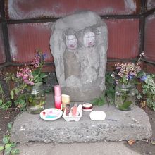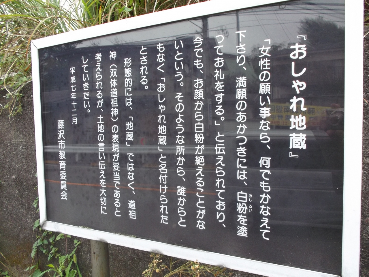 藤沢市羽鳥5丁目、県道沿いというよりもメルシャン藤沢工場通り前と言ったほうが判り易い。路傍に小さなお堂があります。中にお地蔵さん(双体道祖神石像?)2体、顔のあたりに白い粉化粧が施されています。側の解説板には「女性の願いならなんでも叶える。願いが叶ったらお礼に顔に白粉をぬるのが習わし」とあります。