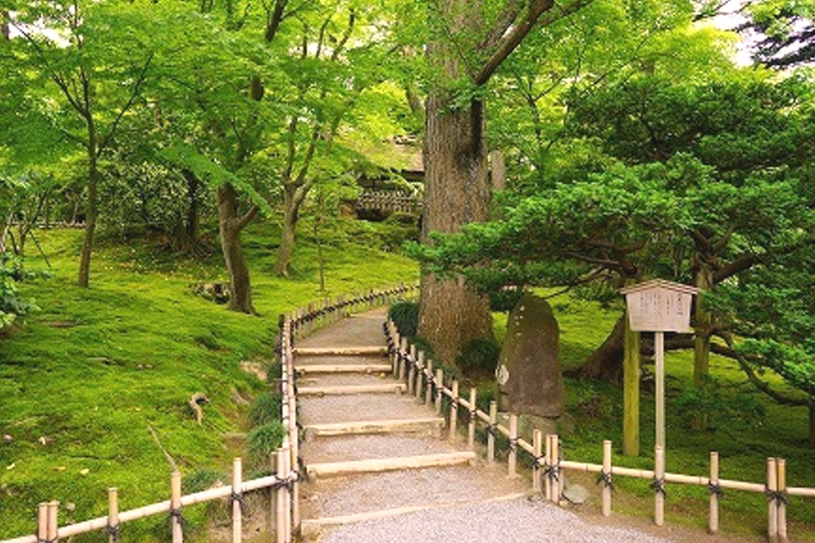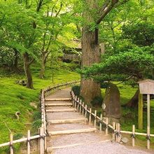 小立野口付近にある、一面を覆った苔の緑が美しい築山が山崎山 です。山頂まで散策することができます。別名「紅葉山」とも呼ばれ、秋になるとカエデ、トチノキなどが赤や黄に美しく色づくそうです。残念ながら夏なので・・・