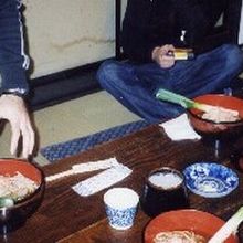 大内宿の入口から4軒目の右側に「三澤屋」があり、民宿を兼ねた食事処です。名物の高遠そば(1050円)は、そばに添えられた丸ごと1本の長ネギを箸代わりにしたり、薬味としてかじったりして食べるので有名なお店です。そばの中には薬味として、大根の搾り汁、かつお節、大根おろしが入っています。建物は茅葺き屋根で造られた建物で立派でした。平日の昼頃寄りましたが、三澤屋はもう並んでいて、紙に名前を書き予約をして待ちました。待つ人の為に囲炉裏があり温かかったです。しばらく待ち「2階の部屋でよければ」と2階に上がりました。2階は4畳半位の和室が3つありました。時代劇で良く見るような屋根裏部屋で天井が低くめでした。(坂本竜馬暗殺の部屋みたい)柱や梁の色が時代を重ねて黒く良い色になっていて趣があります。小さい押入れがあり気になって開けてみたら物置らしく、クマのプーさんのでっかいぬいぐるみとヤマキのめんつゆのダンボール箱があり印象的でした。名物の高遠そば(1050円)を頼みましたが混雑している為20分位待ちました。部屋の横に急勾配の階段があり従業員の方が走って持ってきました。(厨房とつながっているらしい)そばにはたっぷりの大根おろしと鰹節がかかっていました。丸ごと一本のねぎは太く、丁度そばが引っかかるように根元は少し曲がっていました。そばは普通でしたけど、ねぎで食べる新しい感覚で美味しく食べれました。ねぎはちょっと辛めでしたがそばと一緒に食べると美味しいです。有名店なので、土日や昼頃は観光バスの団体客の予約等で入れない恐れがあるので、早めの時間帯が良さそうです。一階は大広間にテーブルがいくつかあり、なんか落ちつかなそうで、2階の席に座れたらラッキーです。個室状態で落ち着くし、屋根裏は趣があり、木造りの建物と香りが好きな人にはたまりません。
