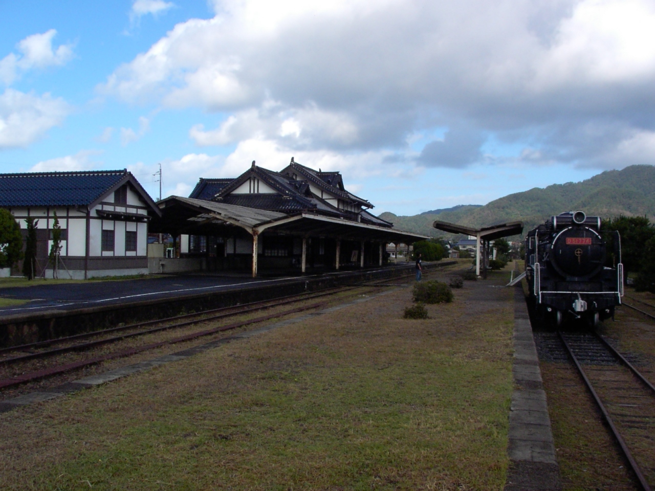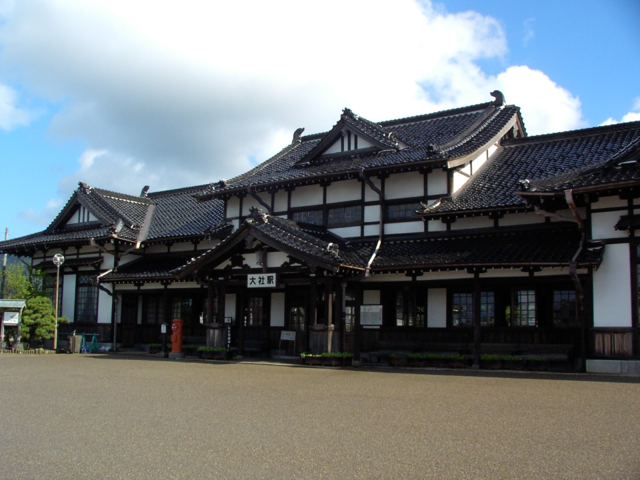 出雲大社参詣客輸送のために敷設され、かつては東京から直通の寝台夜行列車もあった大社線の終着駅です。とはいえ出雲大社までは徒歩で30分近くかかる距離にあり、その中途半端さもあってか1990年に路線廃止となりました。大社駅の駅舎は荘厳な和風建築であり、出雲大社を模したものです。駅舎だけでなく駅のプラットホーム、線路も残されており、D51が中途半端に展示されています。かつて駅舎内に鉄道に関する展示コーナーがありましたが閉鎖され、待合室や団体改札口などがきれいな状態のまま残されています。わざわざ遠方から出雲大社に参詣した人を恥ずかしくない駅で出迎える、という創建当時の心遣いを感じます。