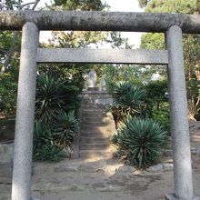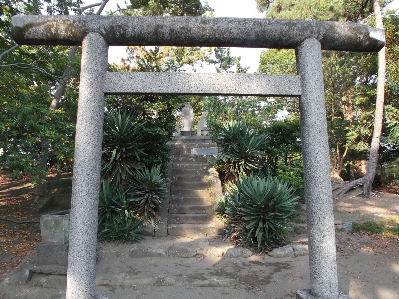 辻堂古道を歩きながら宝珠寺を目指していたら、「あいさつ通り」の標識があり1本路地を紛れたら出合いがしらに砂丘らしきところにクロマツの林。そのちょっと高台に鳥居がみえる、でも社殿がない・・砂丘の頂まで行ってみたら、古く崩れそうな鳥居、その先に石段・玉垣の中に大きめな三つの石碑(大明神・霊等の文字が刻まれてる)があります。過っては社殿のある神社だったのでしょうか?。