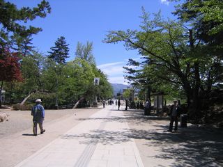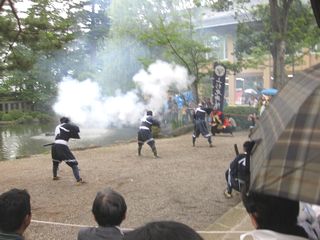 日曜日に行きましたが、稽照殿前にある広場で巨大な火縄銃を使い、米沢藩古式砲術保存会の方々らしき人々が実演していました。火縄銃は撃つのに時間がかかるらしく、火を点火してから数分間じっとしていて、その間指揮官らしき人が色々火縄銃の歴史や砲術に付いて説明してくれました。準備が整い指揮官の号令とともに銃が放たれ、物凄い轟音でビックリしました。撃った人も後ろに反り返り反動が凄かったです。中々見れるものではないので感動しました。