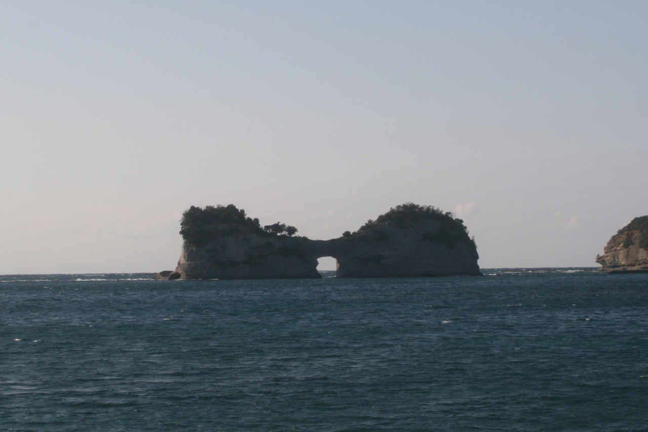 円月島は、南紀白浜のシンボルです。正式には「高嶋」と云うそうで、南北130m、東西35m、そして、高さは25mの島です。その島の中央に海蝕洞がぽっかり開いています。この穴の中に沈む夕陽もまた一興の様です。最適の場所を求めて海岸線を移動することになるのでしょう。