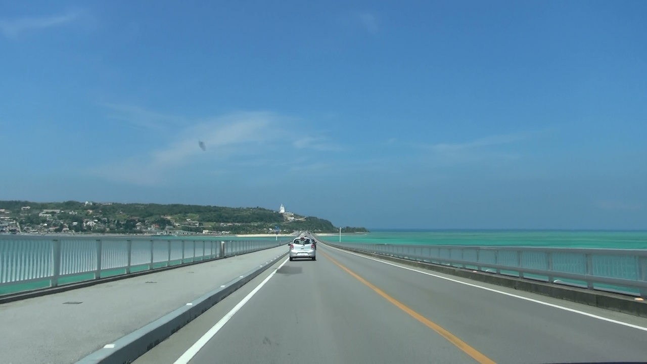 橋の入り口は少し下り坂になっており、期待感が高まります。橋に入ると一面のきれいな海!