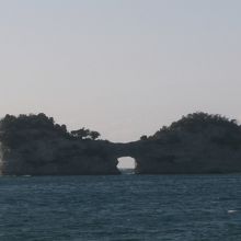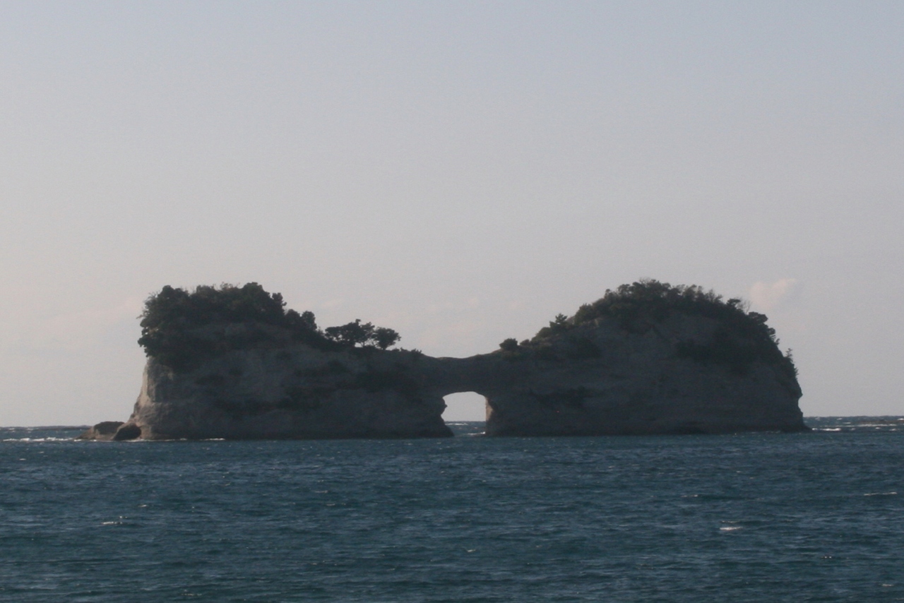 円月島は白浜の臨海浦の沖に浮かんでいます。臨海浦沿いの道路からはそこそこに距離がありますが、大潮に時には腰くらいまで水に浸かれば歩いて行けるそうです。とは云うものの、近年、風波によって岩の崩落が進んでいるそうで、このままでは穴の上部が崩落する可能性が高くなっているそうです。町は、崩落防止の工事をしているとか・・・。