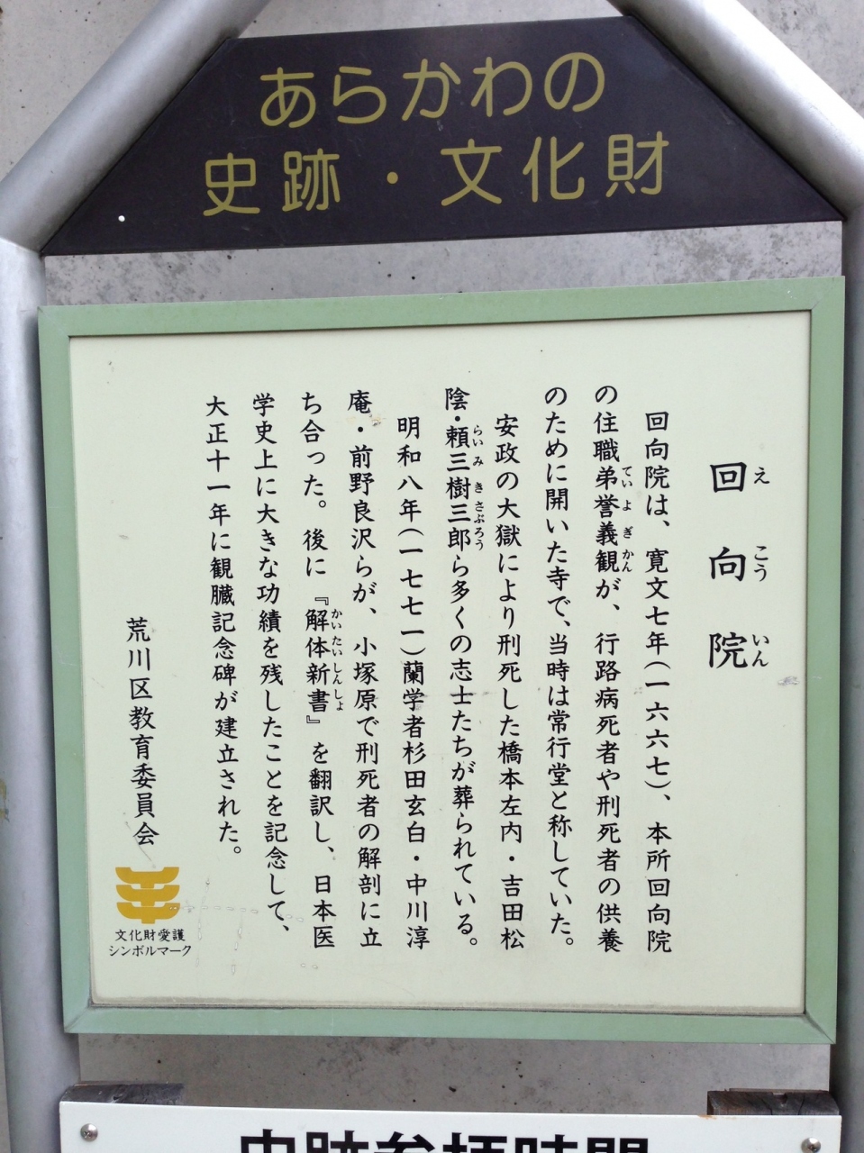 このお寺の立つ場所こそが、小塚原刑場跡地であり、そこでの刑死者は20万人もの方々であるそうです。その御霊を回向するために、本所にあった回向院さんの分院として設置されたのがそもそもの起源のようです。