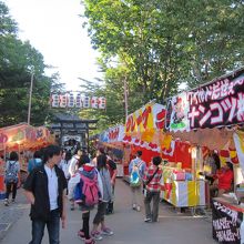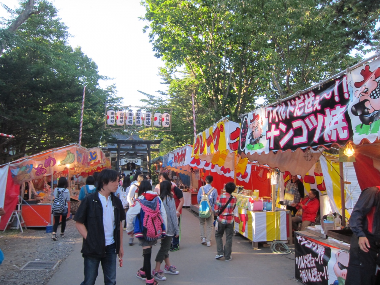 200mほどの参道の両脇には屋台が並び、地元の小・中・高校生のほか、家族連れなどで賑わっていました。焼きイカ・つぶなど海産物が目立つのが北海道らしいところです。70~80席はありそうな特設のテーブル・椅子などが用意されていました。