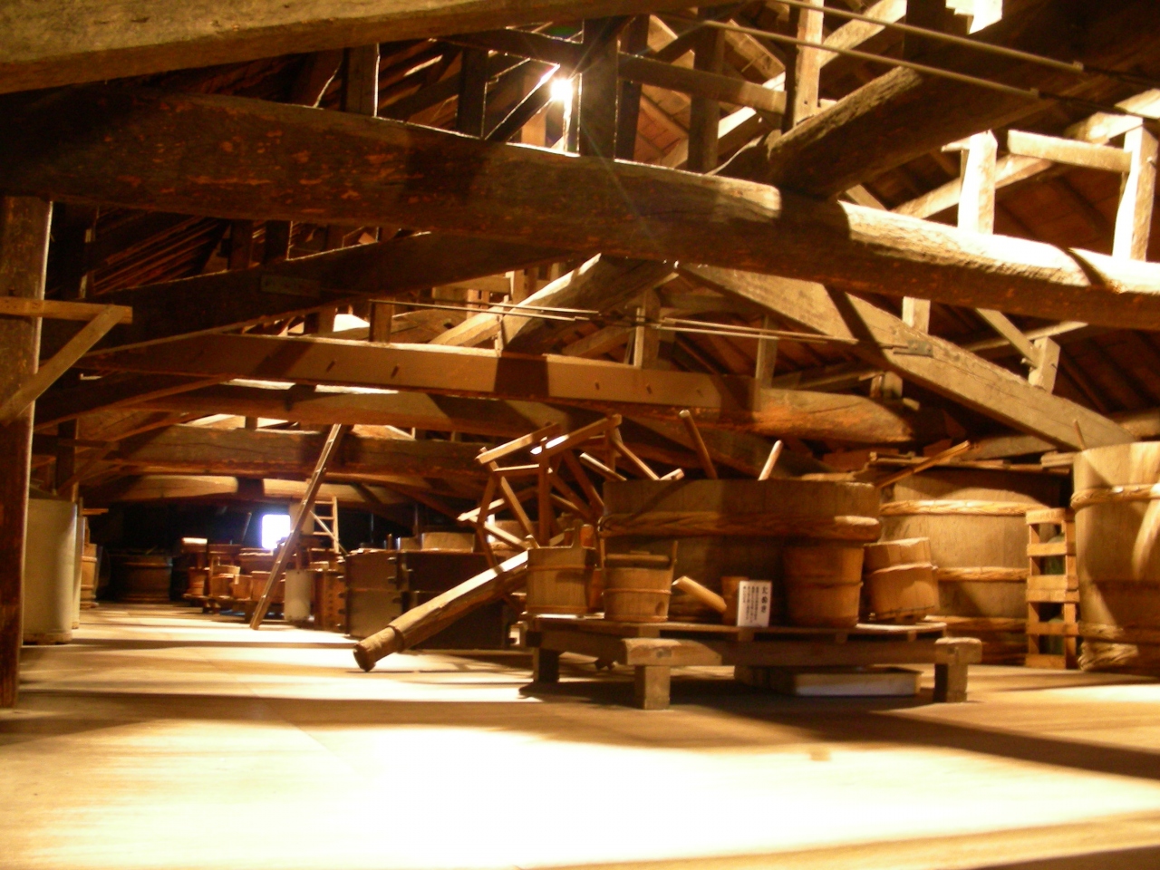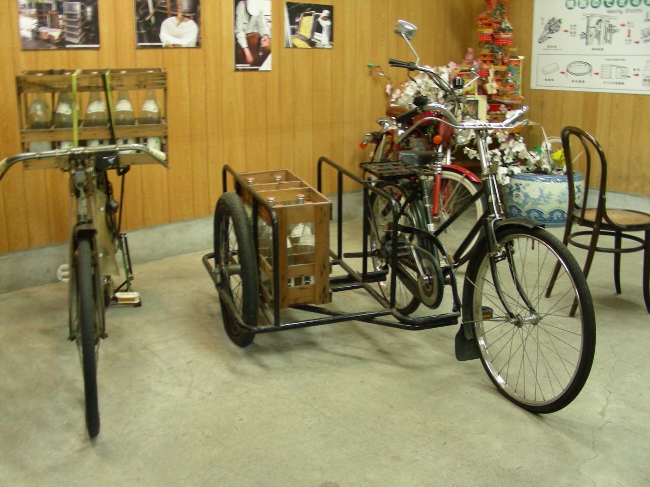 現役の酒造元「薫長」の酒蔵を開放したもので、古い木製の酒造道具に加え、現役の金属製醸造桶も見ることができます。また、レトロな販促ポスター、一升瓶を入れた木製ケースごと運ぶ運搬用の自転車サイドカー、エンジン付き自転車など、昭和レトロな品々が並び、つい見入ってしまいます。蔵人が気軽に質問に答えてくれるのも楽しかったです。