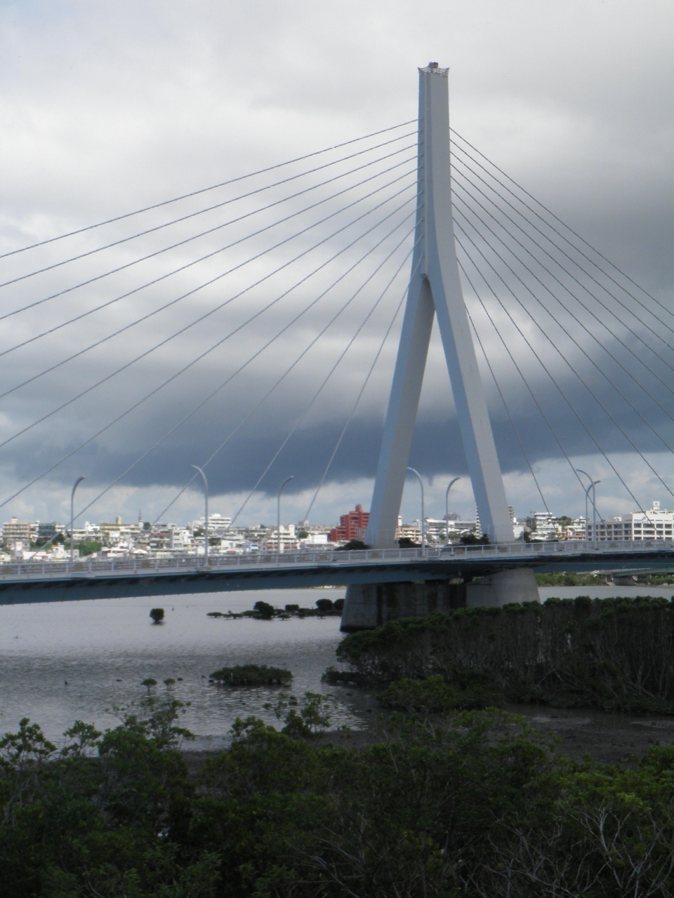 沖縄本島の南部をドライブして、那覇のホテルに戻るときとよみ大橋を通りました。 背の高い白い橋柱がたっていて、姿の美しい橋です。 橋を渡ったところに、漫湖の湿地の木道がある自然観察センターがあってのんびりするのにいいところでした。