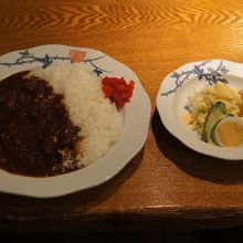 伊万里鍋島焼会館は、大川内山の入口にある共同の販売所。ここである程度お気に入りの窯を絞っておくのもいいかもしれません。ただ、私はここの喫茶コーナーでハヤシライスをいただきました。どんな器で出されてくるのか興味津々でしたが、皿のふちにちょろっと一輪の花をあしらったもの。どうしても豪華な西洋食器と比べてしまうんですが、まあまあかなあというレベルでしょう。