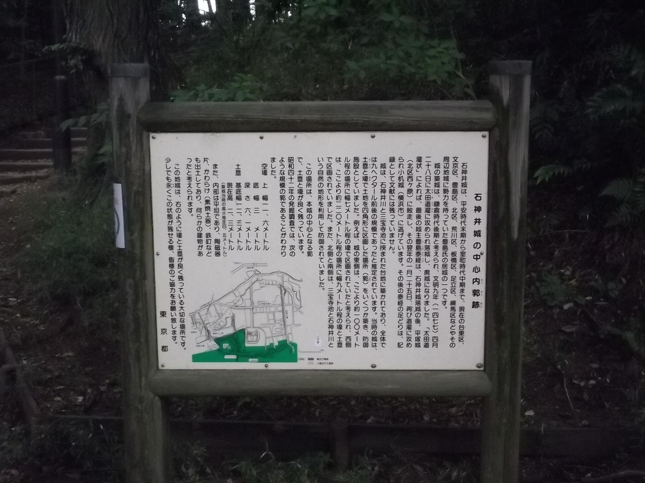 近くにある説明板には、旧石神井城の築城から落城し廃城とともに城域は石神井川と三宝寺池に挟まれた台地に築かれていたなどが記されています。