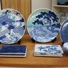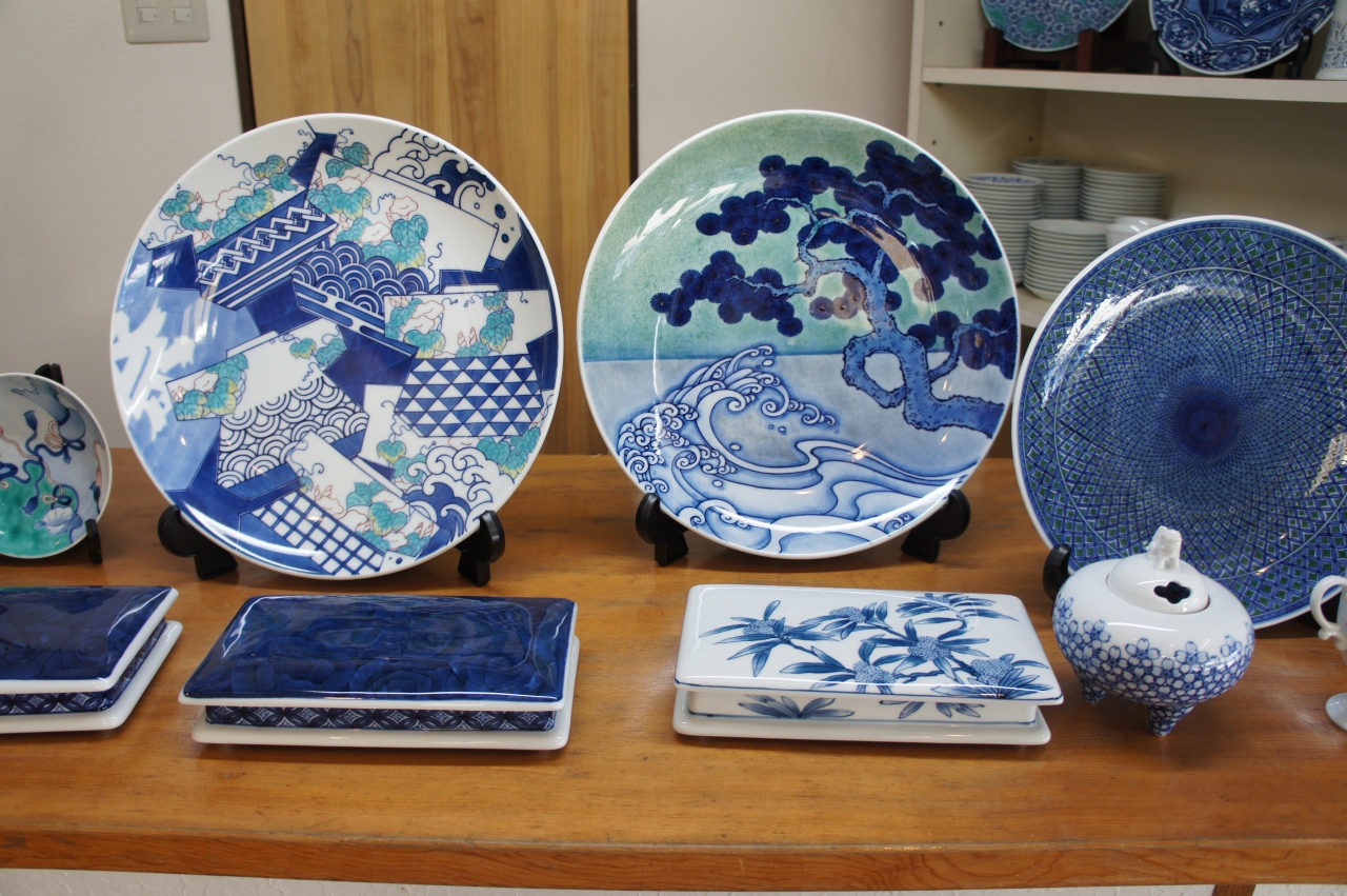 太一郎窯は、大川内山の焼き物通りを上りはじめてすぐ。染付が中心の品ぞろえですが、呉須の色が濃い藍色をしていて、とてもおしゃれな感覚。色絵皿の方も、青がいかに美しく見えるかといった配色を考えているようで、はっきりと特徴があります。私は、基本的に染付が好きなので、こうした工夫は大歓迎です。