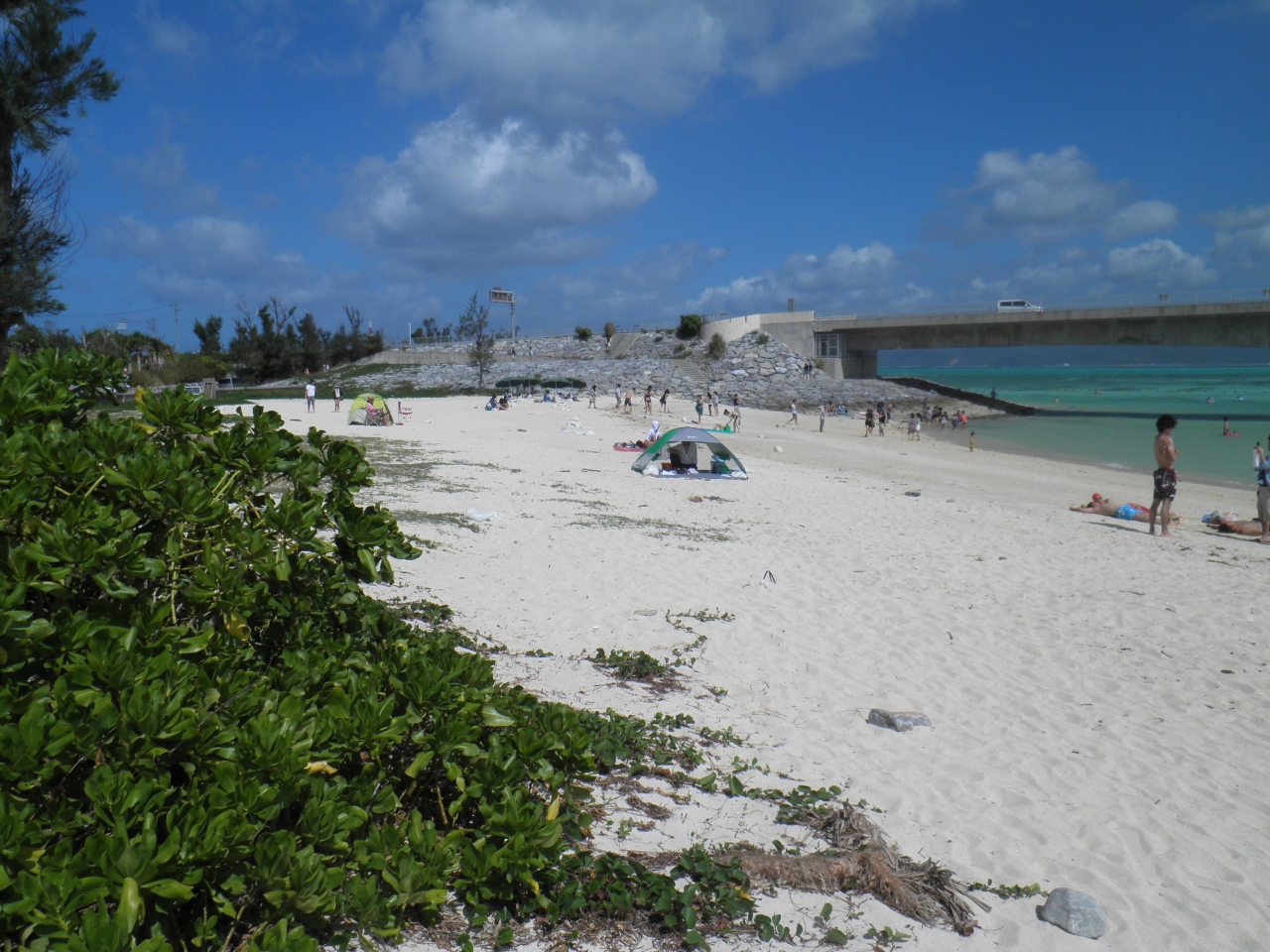 古宇利大橋を渡ったところにある古宇利大橋の景観がすばらしいビーチです。 日影がすくないところなので、日焼け対策したほうがいいようです。 以前は木が少しあったけど、なぜか伐採されていました。 数年前は橋柱のところに魚がたくさんいたけど、今はほとんどいないようです。