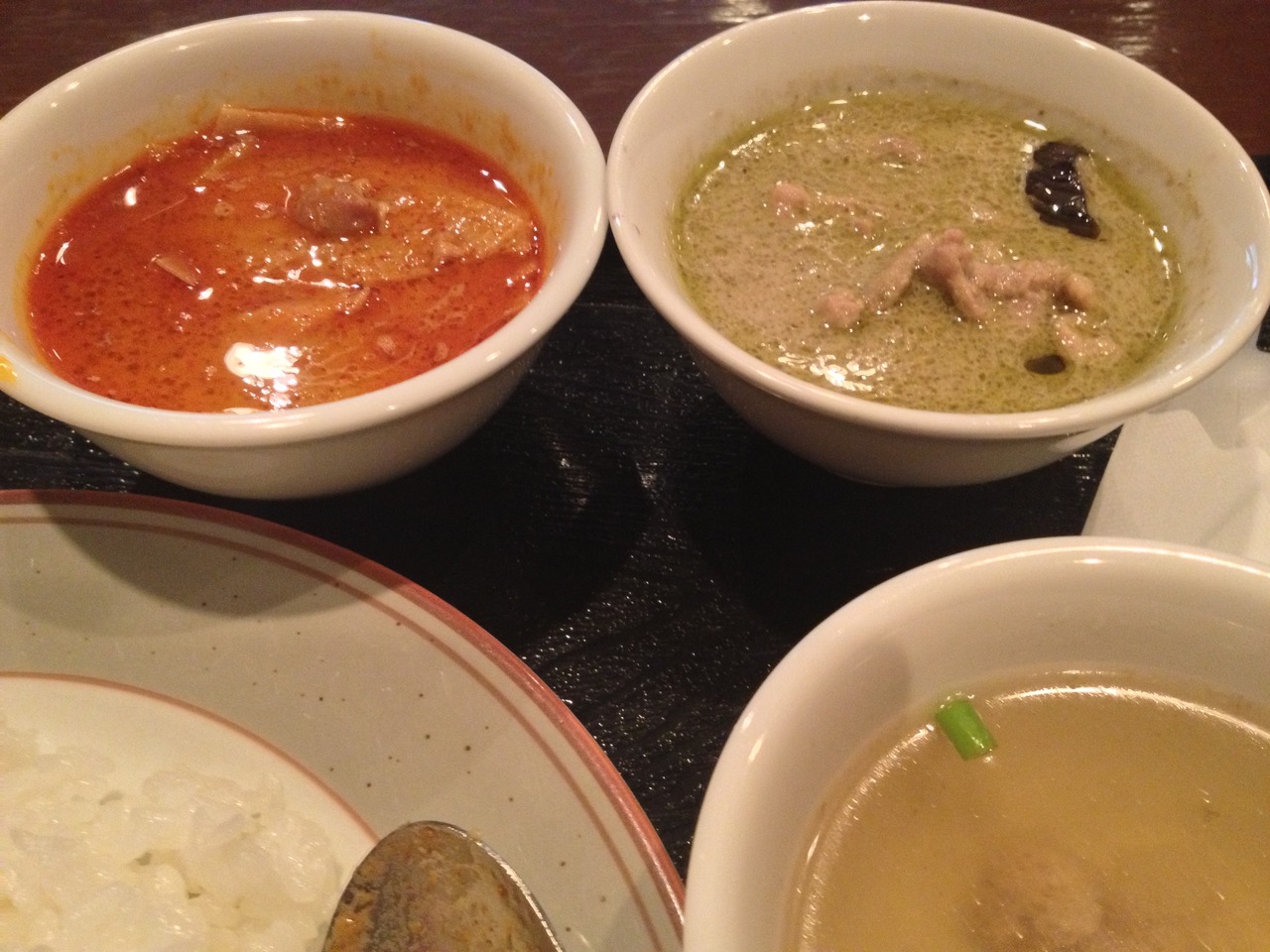 大森駅北口からほど近いタイカレー屋さん。ランチは800円で二種類のカレーとライス、スープのセットがあります。今回は辛さ星二つのレッドカレーとグリーンカレーにしました。タケノコと鶏肉入りのレッドカレーが辛いけどとても美味しいです。グリーンカレーは独得の香りで、ちょっと好みが分かれるかも。