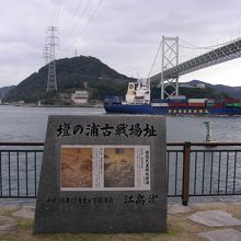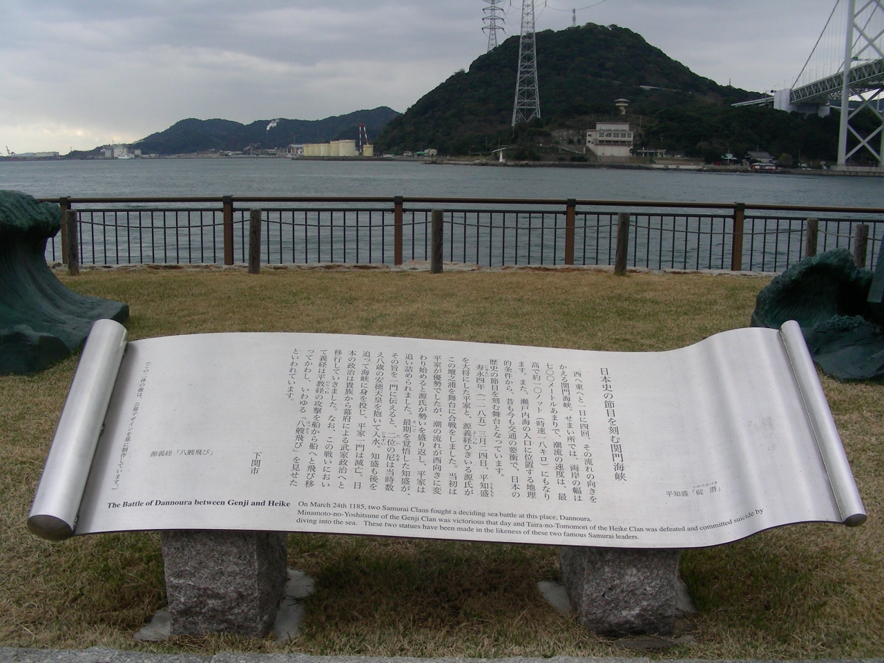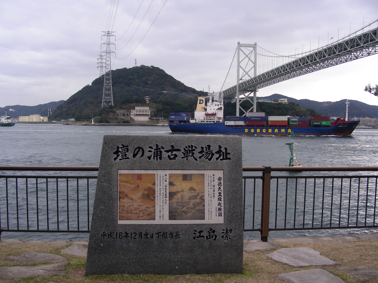 関門海峡の最も狭まったところで潮流が激しく、行き交う船が発する波も相まって常に飛沫が舞うところです。巨大な関門大橋、大型貨物船の航行と思い切り近代化された景観ですが、義経の「八艘飛び」、安徳天皇入水と、平家物語に描かれた合戦の模様が波間に浮かぶような心もちにされます。史跡としての案内看板が充実しています。